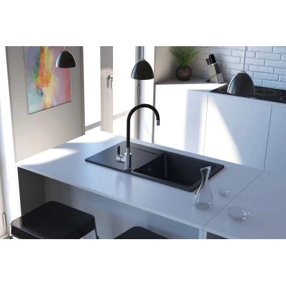 Die Einbauspüle ist aus hochwertigem Granitverbundstoff gefertigt. Dabei handelt es sich um ein wiederstandfähiges Material, das sich als stoßfest erweist. Es besticht überdies durch seine pflegeleichten und hitzebeständigen Eigenschaften. Daher können auch kochheiße Töpfe oder Pfannen auf der Oberfläche abgestellt werden, ohne dass diese leidet. Gehalten ist die Spüle in der Trendfarbe Graphit-Grau mit natürlich wirkender Optik. Ihre Montage erfolgt flächenbündig durch Einsetzen und Verkleben in einen passenden Ausschnitt. Dadurch liegen Spüle und Arbeitsplatte auf einer Ebene. Je nach Einbausituation kann die Ausrichtung von Abtropffläche und Becken frei gewählt werden.