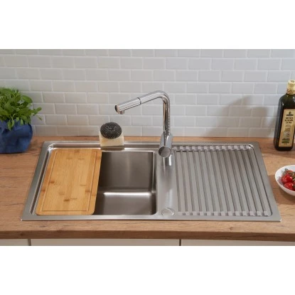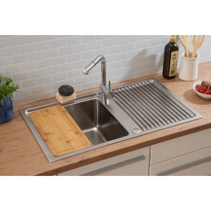 + Edelstahlspüle mit 1 Becken und Abtropffläche