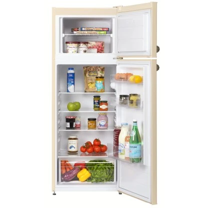 Die Respekta Kühl-/Gefrierkombination KS144 Vintage VC in Cream überzeugt vor allem durch ihre Funktionalität. Das Gerät besitzt neben einem Kühlinhalt von 171 Litern einen Nutzinhalt des Gefrierfachs von 42 Litern. Somit finden nicht nur Ihre frischen Lebensmittel und Getränke genügend Platz, sondern auch Vorräte, die tiefgefroren sind. Zusätzlicher Komfort wird durch verstellbare Füße, einen wechselseitigen Türanschlag, LED-Beleuchtung im Kühlraum oder auch dem automatischen Abtauverfahren im Kühlteil erreicht.