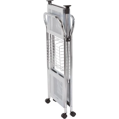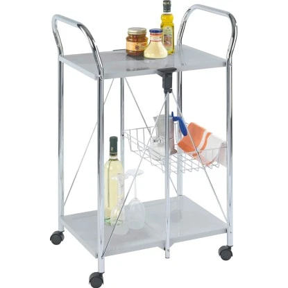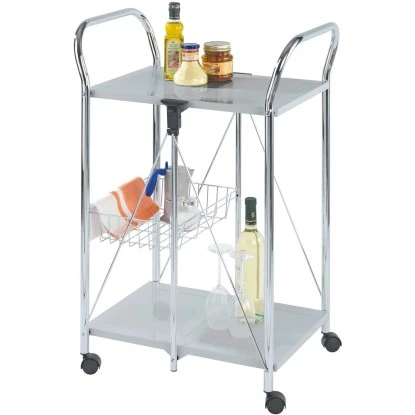 Das robuste Chrom-Metallgestell sorgt dabei für Stabilität. Die Belastbarkeit beträgt bis zu 40 kg. Der Wagen kann mit einem Handgriff zusammengeklappt und damit sehr platzsparend verstaut werden.