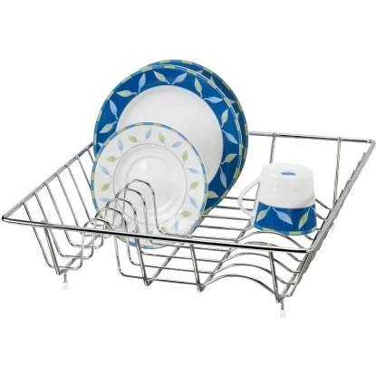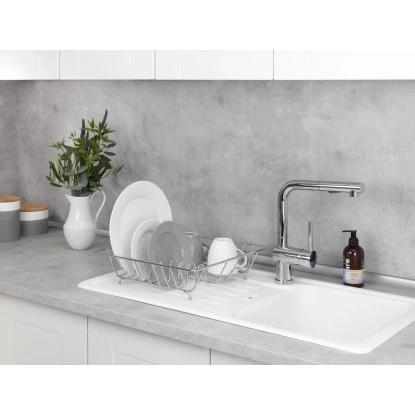 Der Geschirrabtropfkorb von Wenko aus verchromtem Metall erweitert einfach und dabei platzsparend die Spülbeckenablage um Stellmöglichkeiten für Teller, Tassen und Gläser.